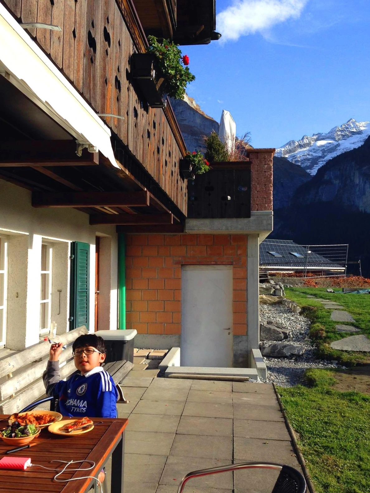 눈앞의 경치나 감상하며 별 일정 없이 늘어지게 쉴 생각이었다. 녀석은 축구를 하다가 싫증나면 그네를 타거나, 그것도 아니면 고양이나 토끼랑 놀면서 마음 끌리는 대로 저 하고 싶은 것을 하며 보내지만 난 그럴 수 없었다. 고무장갑도 없이 오랜만에 손빨래 신공을 펼치고 끼니때가 되면 밥을 차리고, 손톱 깎고, 게다가 구멍 난 양말도 찾아 기우고... 겨울이 되려면 아직 많은 날이 남았는데 스위스 산간 마을의 해는 너무나 짧다는 것을 몸소 체험한 하루였달까. 그래도 앞산을 바라보며 차 한잔 할 수 있어서 그것 만으로 감사했다.