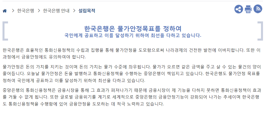 우리나라 중앙은행인 한국은행은 물가안정 목표를 정하여 국민에게 공표하고 이를 달성하기 위하여 최선을 다하고 있습니다. 아래 홈페이지에도 그 내용을 알리고 있습니다.