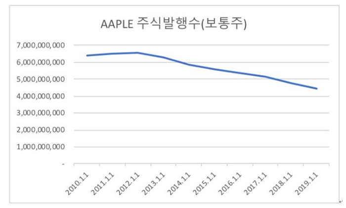 여기서 알 수 있듯이 애플의 2014년부터 2019년까지 영업이익과 순이익은 크게 증가하지 못했으나 EPS는 중간에 Up&down이 있으나 추세적으로 증가하는 것을 알 수 있다. 그 이유가 바로 벌어들이는 이익으로 자사 수매 입 후 소각하는 활동들을 통하여 주주친화 정책을 펼쳐왔기 때문이다. 그렇게 되면 동일한 이익을 벌어들이더라도 EPS는 증가할 수 있고 이는 주가 상승으로 이어질 수 있다.