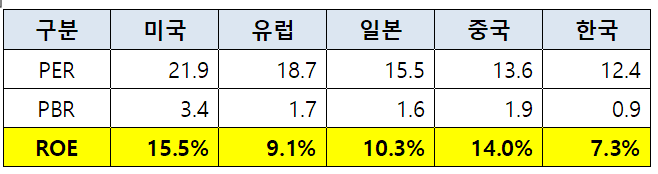 아래의 표와 같이 우리는 국가별 ROE를 추정해 볼 수 있는데, 계산해보면 미국이 15.5%로 가장 높고 한국이 7.3%로 가장 낮은 것을 확인할 수 있다. 언뜻 PER만 보게 되면 한국이 PER와 PBR이 가장 낮기 때문에 기대수익률이 높다고 판단할 수 있지만, 실제로 ROE를 기준으로 보게 되면 미국의 기대수익률이 가장 높고, 내가 미국 주식을 투자하는 가장 큰 이유다.