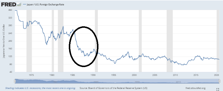 미국 제조업이 어려움을 겪고 일본 제조업의 성장을 보고만 있을 리 없다. 1985년 플라자 합의가 일어난 배경이다. 플라자 합의란 1985년 9월 22일 미국 뉴욕에 있는 플라자 호텔에서 G5 경제선진국(프랑스, 서독, 일본, 미국, 영국) 재무장관, 중앙은행 총재들의 모임에서 발표된 환율에 관한 합의를 가리킨다. 플라자 합의를 통해서 일본 엔화에 대해 약 50%가량 평가절하하게 된다.
