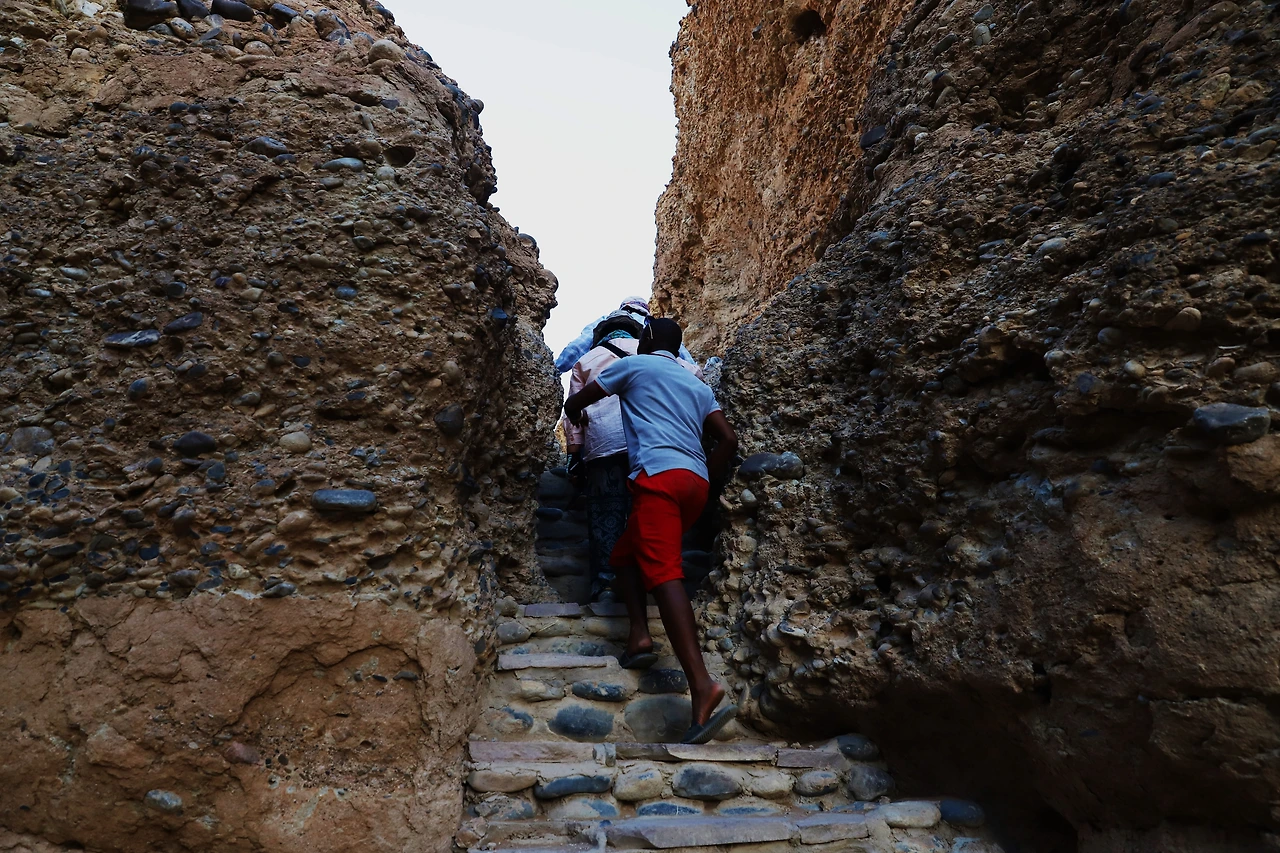 모래가 쌓여 굳어진 벽이 오후 햇살에 붉은빛을 띤다.