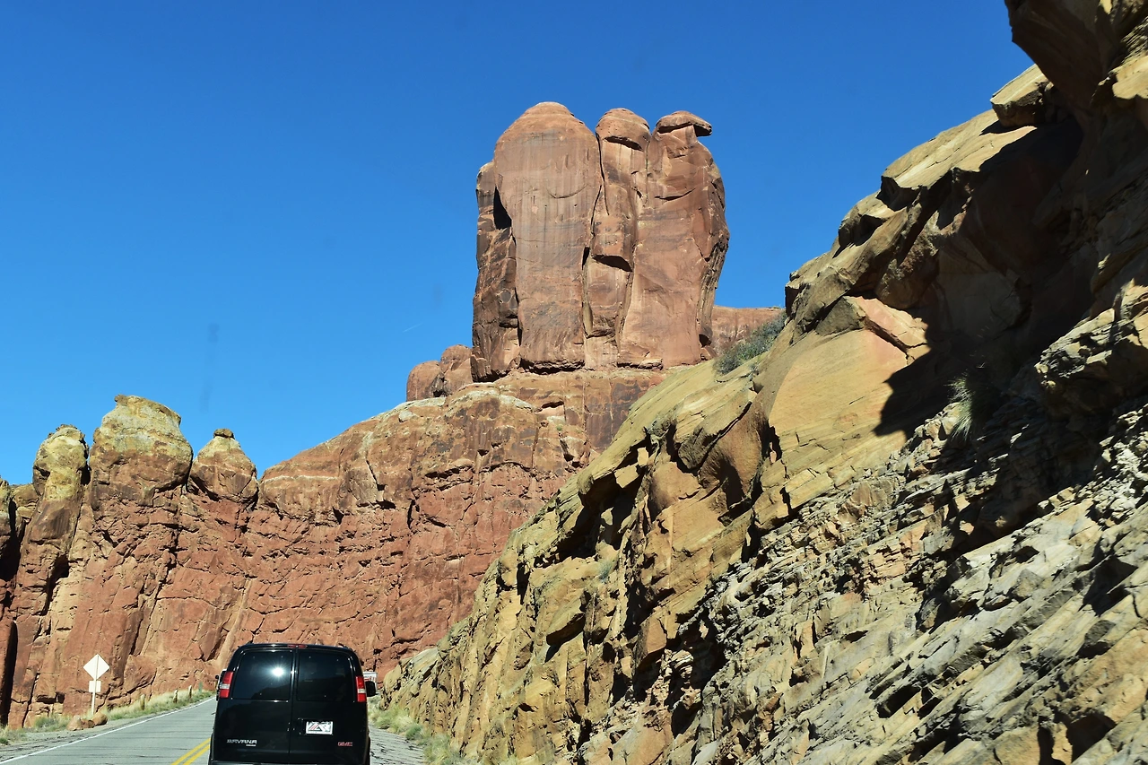 이 분위기는 뭐지. 도로변을 장식하는 우뚝 솟은 바위들이 장관이다. 달리는 차 안에서 계속 이어지는 다채로운 병풍들. 묘하게 늘어선 납작한 갈색 바위산이 여행자의 마을을 두드린다.