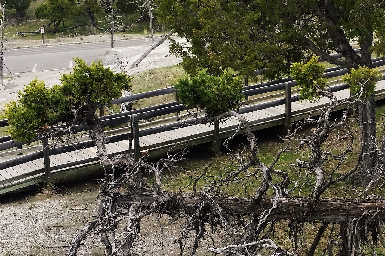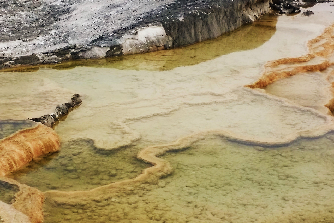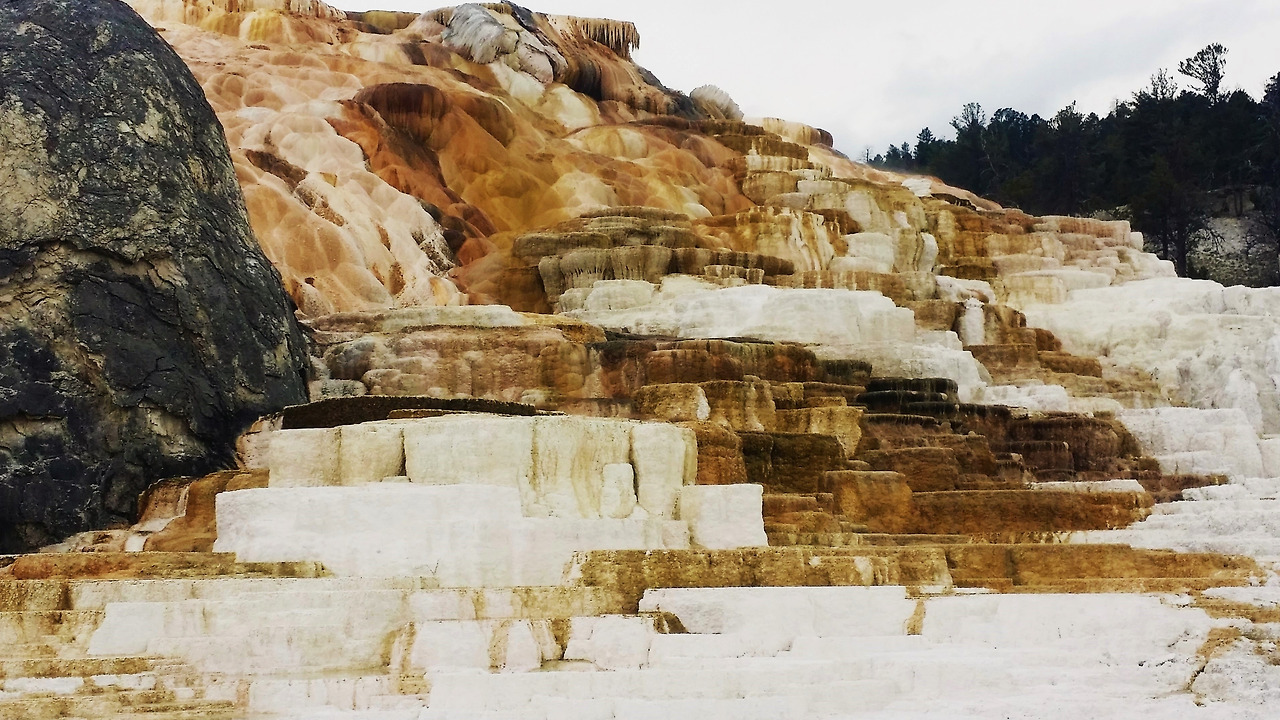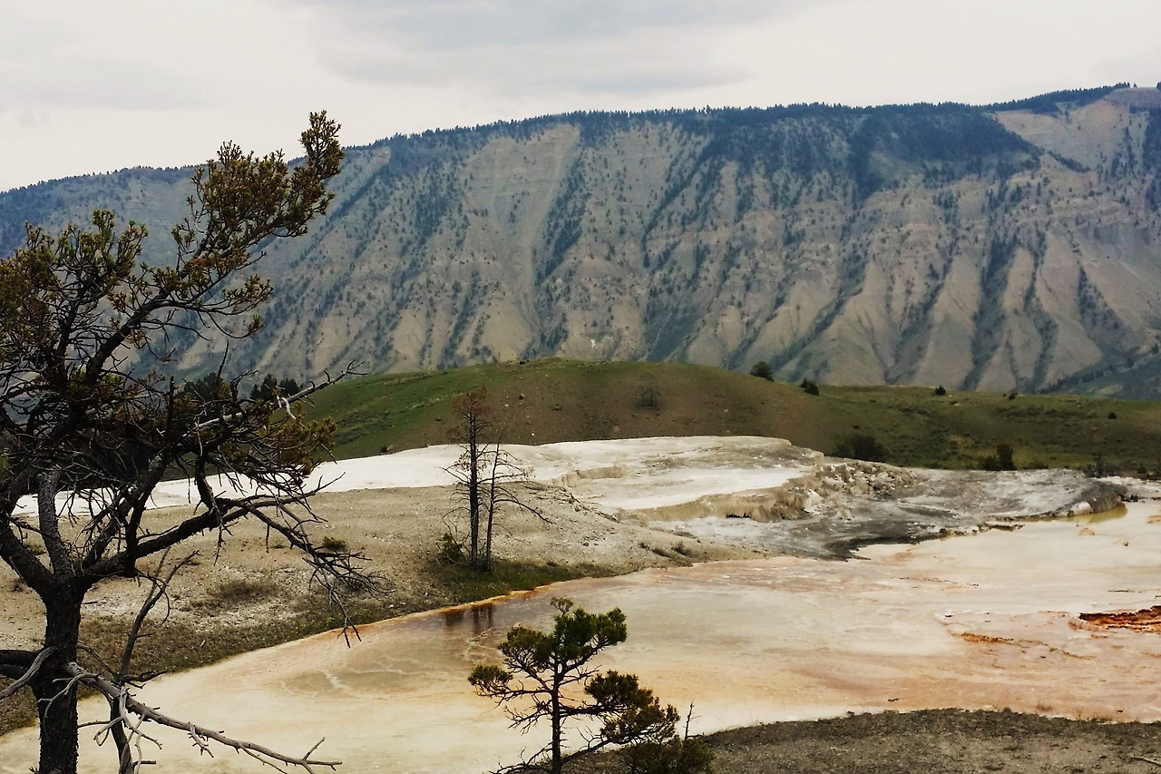 가장 북쪽에 위치한 매머드 핫 스프링 Mammoth Hot Springs. 이곳은 석회질이 많이 포함된 온천수가 계속 흘러내리면서 층층이 쌓아서 만들어진 지형. 1인치 자라는데 100년 걸린다고. 수만 년의 세월이 쌓은 독특한 계곡과 언덕이다.