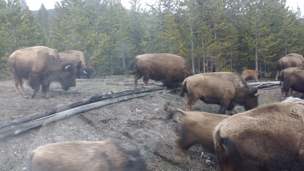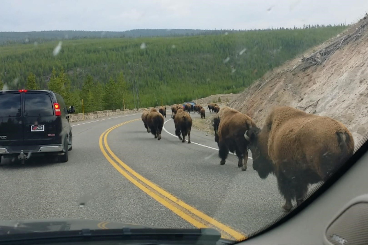 도로를 달리는데 갑자기 숲 속에서 바이슨(아메리카 들소)이 나타났다.