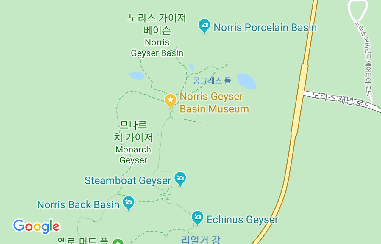 - 노리스 가이저 베이슨 Norris Geyser Basin(가장 뜨거운 산성 간헐천)