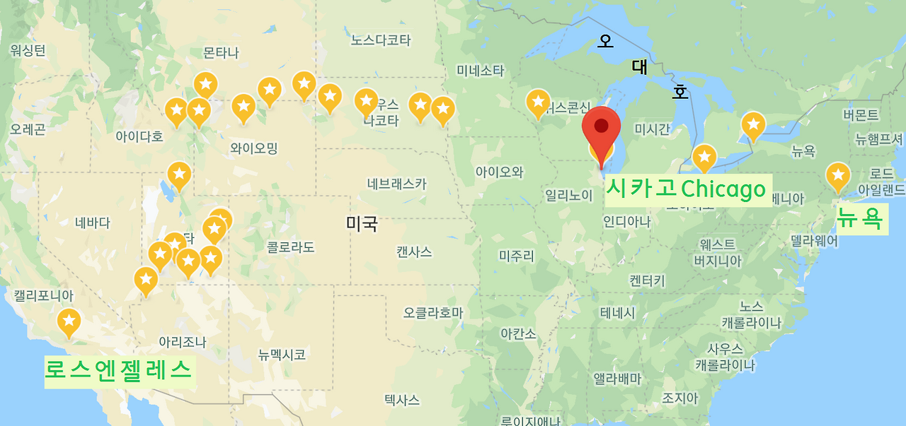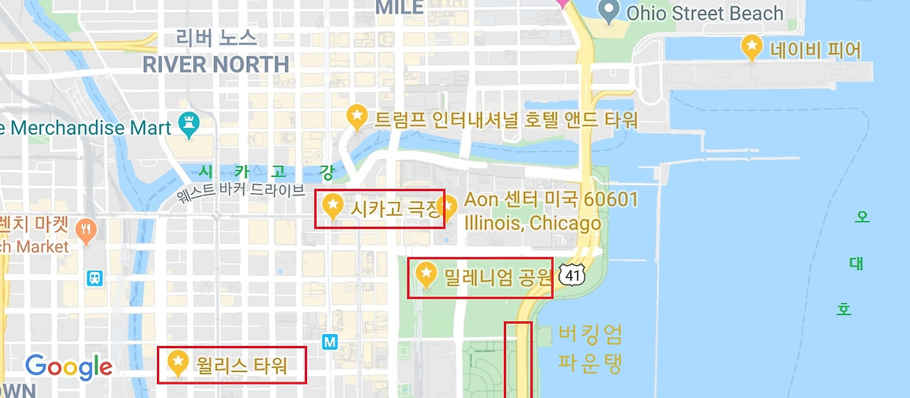 시카고 시내 투어 장소 (구글 지도 편집)오전에는 예약된 벤을 타고 시카고 시내를 구경한다.