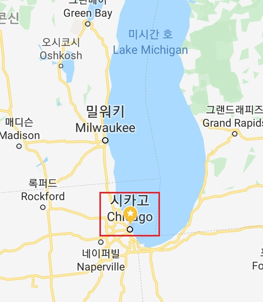 북아메리카 지도를 펴면 미국과 캔다의 국경을 이루는 꽤 넓은 면적을 차지하는 빙하호 5개, 이 오대호 중 미시간호만 온전히 미국 내에 있고 나머지는 미국 캐나다의 국경이 된다. 시카고는 미시간 호 연안에 위치한다.