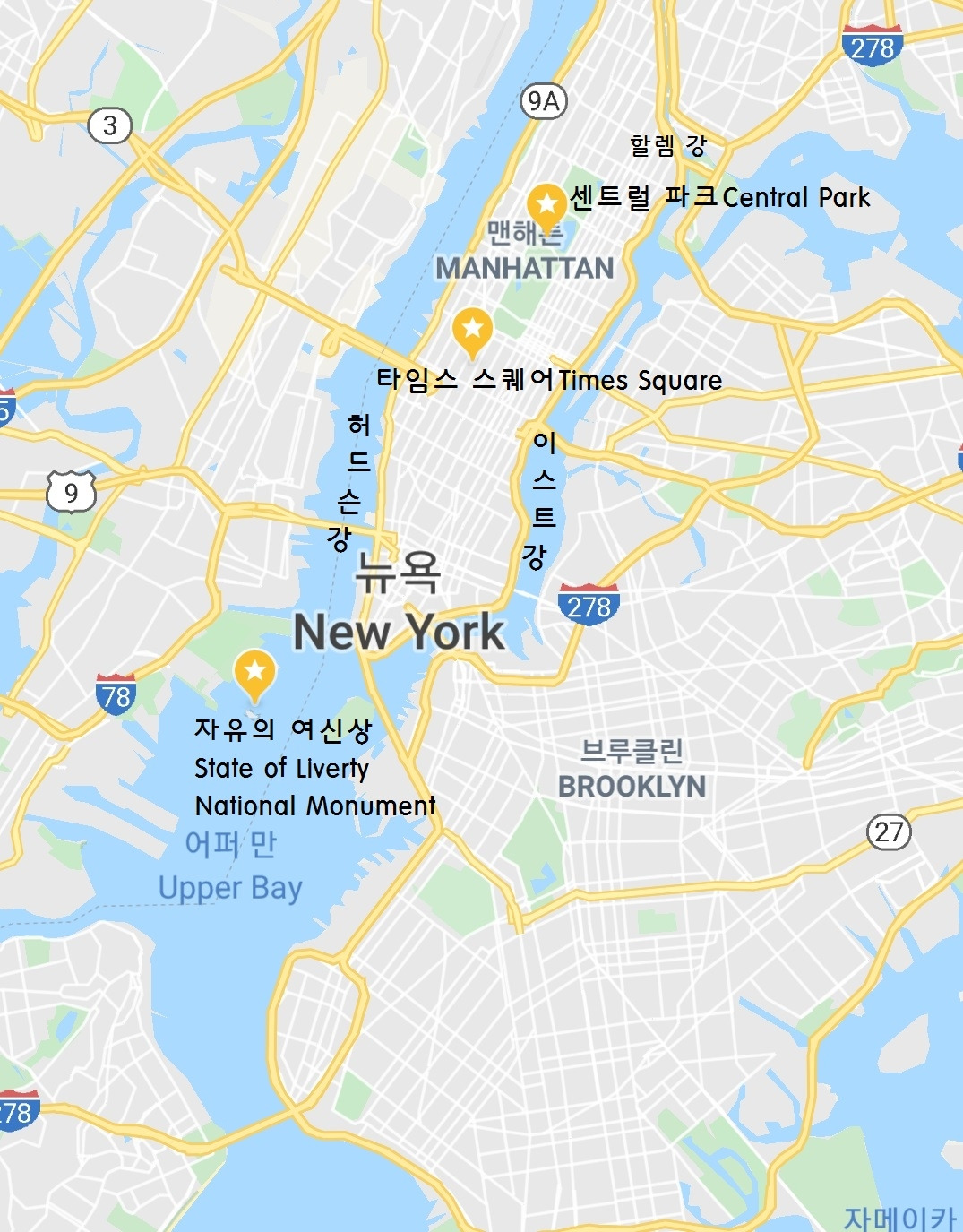 센트럴 파크, 브루클린교, 자유의 여신상.