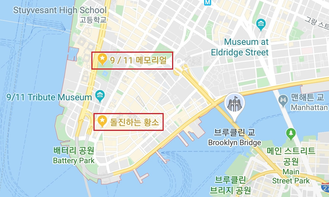 맨해튼 다리 Manhattan Bridge와, 브루클린 다리 Brooklyn Bridge를 지난다.