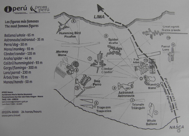 나스카의 비가 내리지 않는 건조 기후와 오랫동안 햇볕을 받으면 갈색으로 변하는 화강암이 있어 가능했던 작품으로 사막 표면의 갈색 돌을 20cm쯤 걷어 내고 바닥의 밝은 색을 드러나게 서 그려진 라인으로 그림 30여 점, 무늬 300여 개(직선 또는 기하학적 무늬), 그리고 무수한 선으로 구성되어 있다. 거미, 벌새, 앵무새, 콘도르, 우주인 등... 그림의 크기는 100m~300m로 거대한 그림이라서 경비행기로 하늘을 올라야 볼 수 있다.