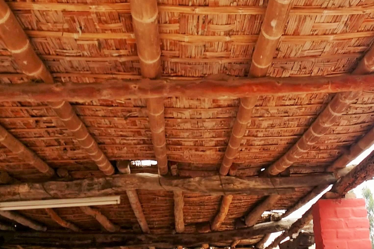 사각형 벽면에 지붕은 나뭇가지 지붕.
