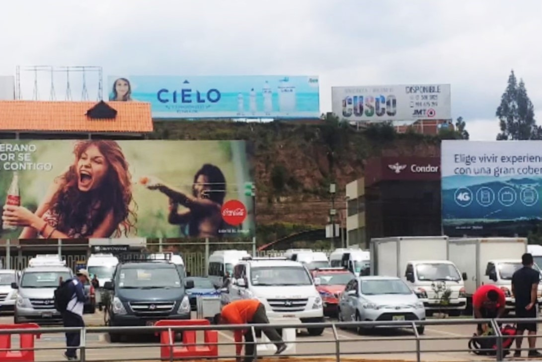 작은 공항 건물 맞은편에 공항을 울타리처럼 둘러싼 광고판이 공항보다 더 커 보인다.