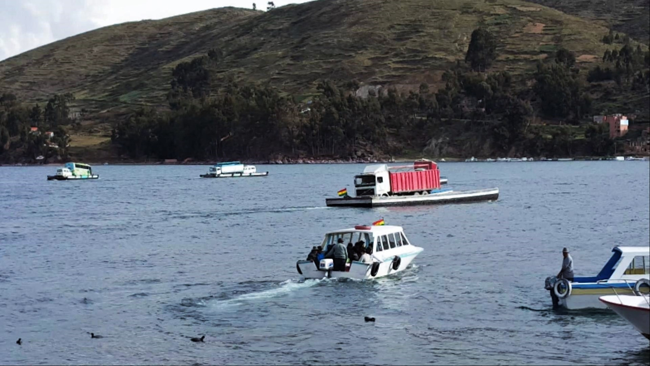 사람은 보트로 이동하고 버스는 작은 바지선에 올려 호수를 건