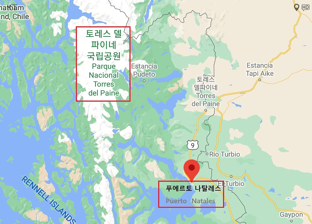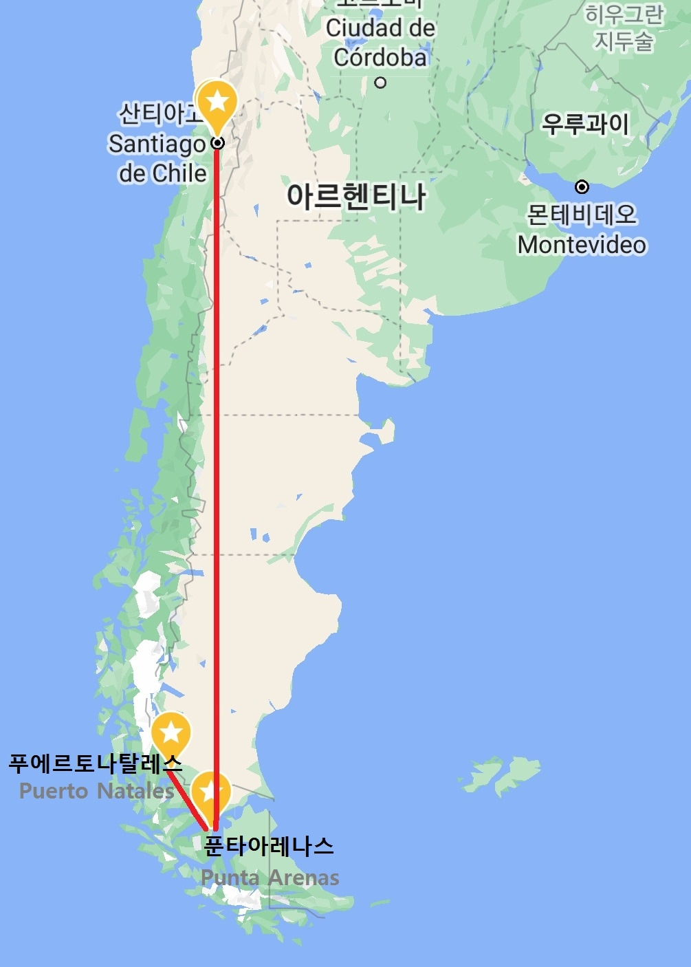 산티아고-푼타아레나스-푸에르토 나탈레스(구글 지도 편집)