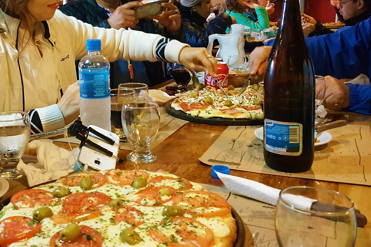 쟁반 크기만 한 피자가 나오니 모두 환호성.