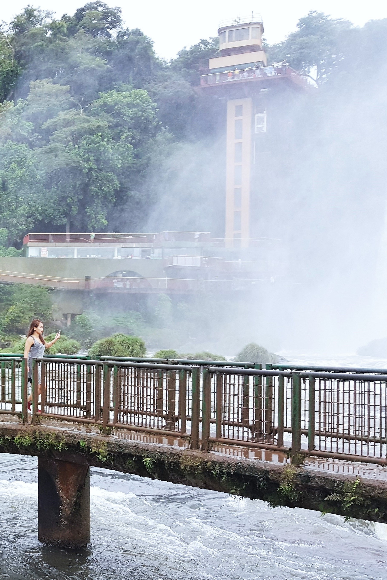 우비를 입었으나 발과 머리가 다 젖는다. 트레일을 따라 강을 거슬러 올라가며 감상하 브라질 이구아수는 가장 길게 연이어 나타나는 아름다운 폭포이다. 슬리퍼가 야간 미끄러워 데크를 조심조심 한 바퀴 돌았다. 데크 산책을 마치고 바로 옆의 엘리베이터로 향했다. 1층에서 2,3층으로 계속 올라가며 더 높은 위치에서 각이 다른 폭포를 감상할 수 있도록 엘리베이터를 설치했다.
