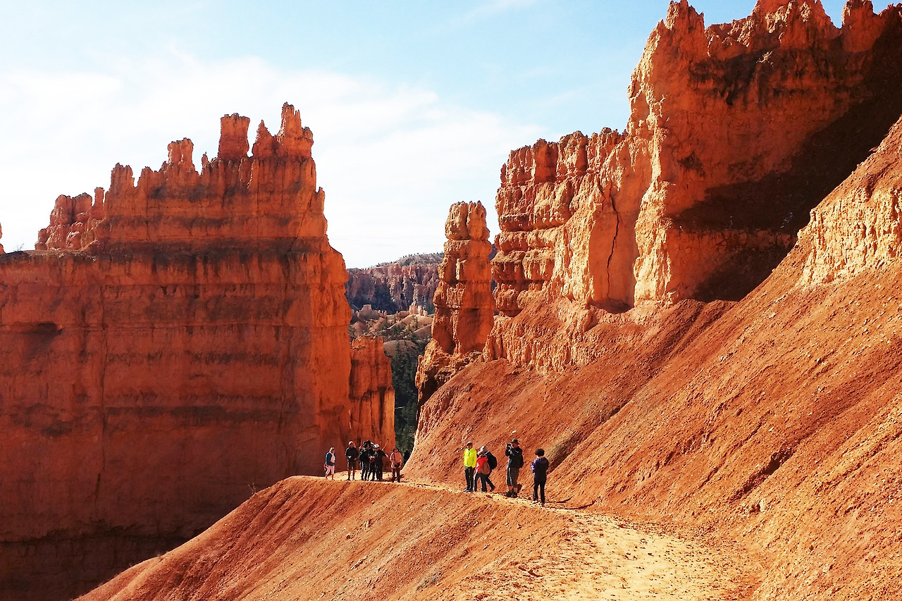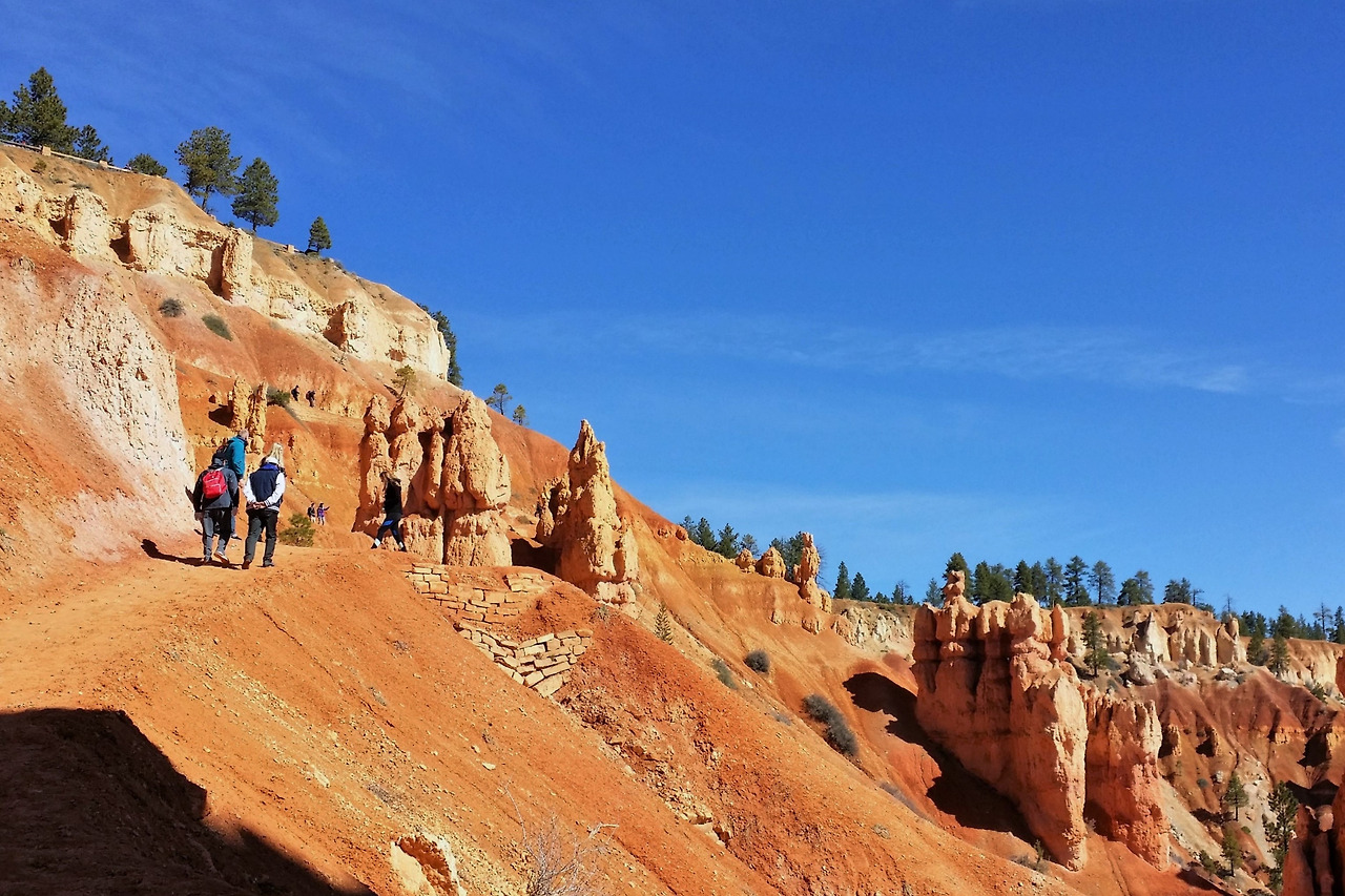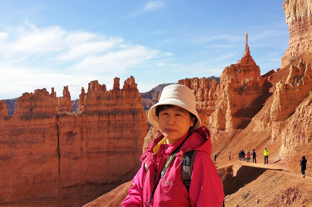 브라이스 캐년은 정착한 초기 정착민 브라이스의 이름에서 유래했단다. 그의 이름을 땄으나, 그가 이 아름다운 공원을 만든 것은 아니고, 자연이 만들어 준 선물이다. 캐년 중 가장 침식이 활발하여 현재도 고운 흙이 계속 흘러내리고 있다. 그래서 움푹 파인 커다란 분지는 세월과 함께 더욱 커지고 있다고. 처음 시작부터 아래로 내려가는 트레일이 지그재그로 급경사이다. 겹겹이 붉은 돌기둥 사이로 트레일이 내려다 보인다. 모두 각자 나름대로 일정을 즐기는 스타일이라 처음에는 함께 출발하고 어느새 뿔뿔이 흩어졌다. 먼저 아래로 내려간 팀이 뒤를 올려다보며 인증 사진도 찍으며 쉬엄쉬엄 전진이다.