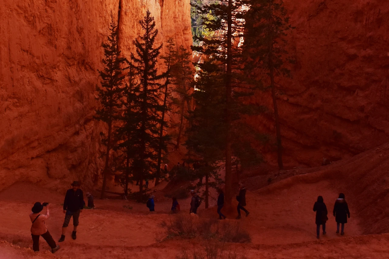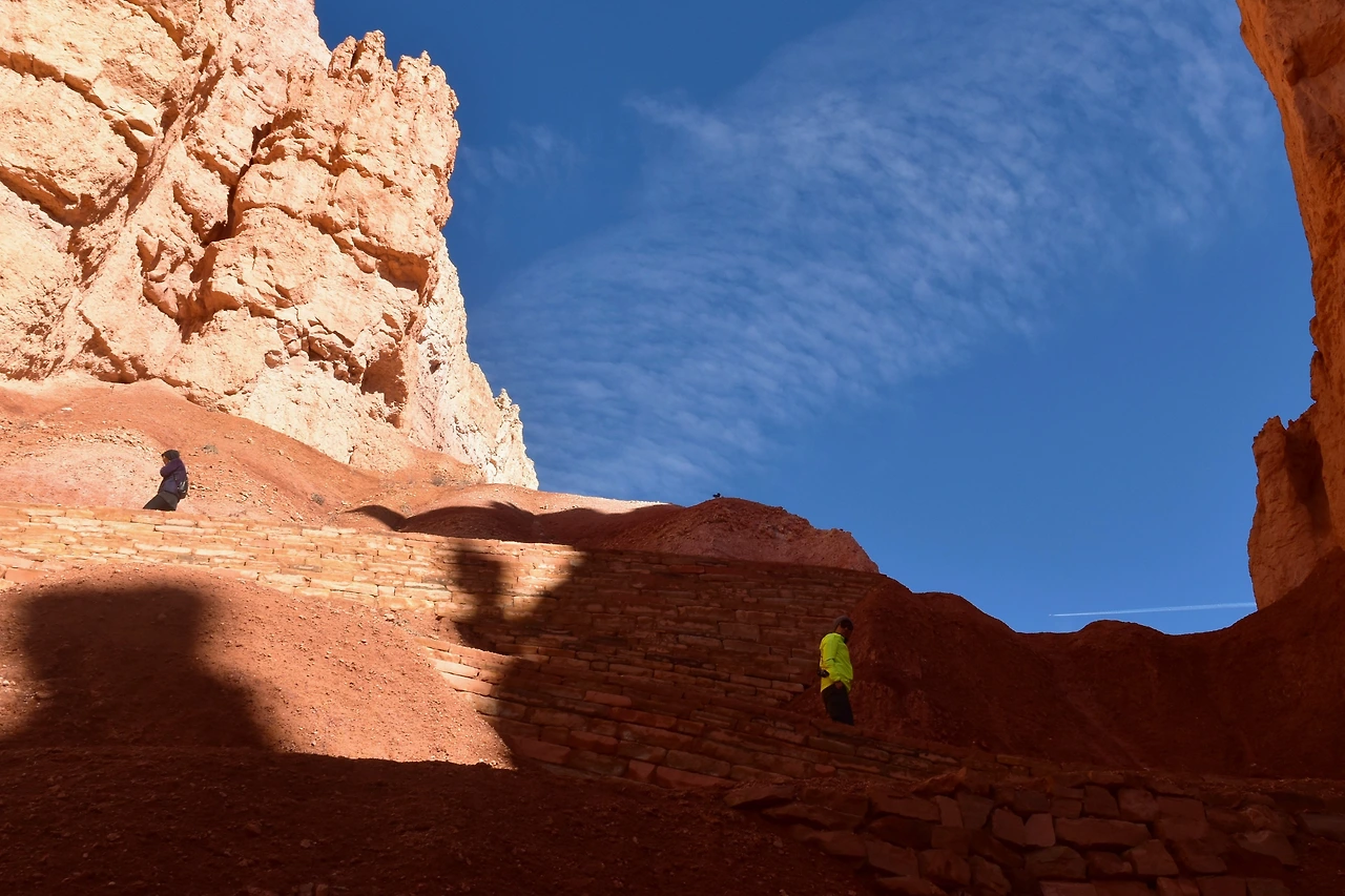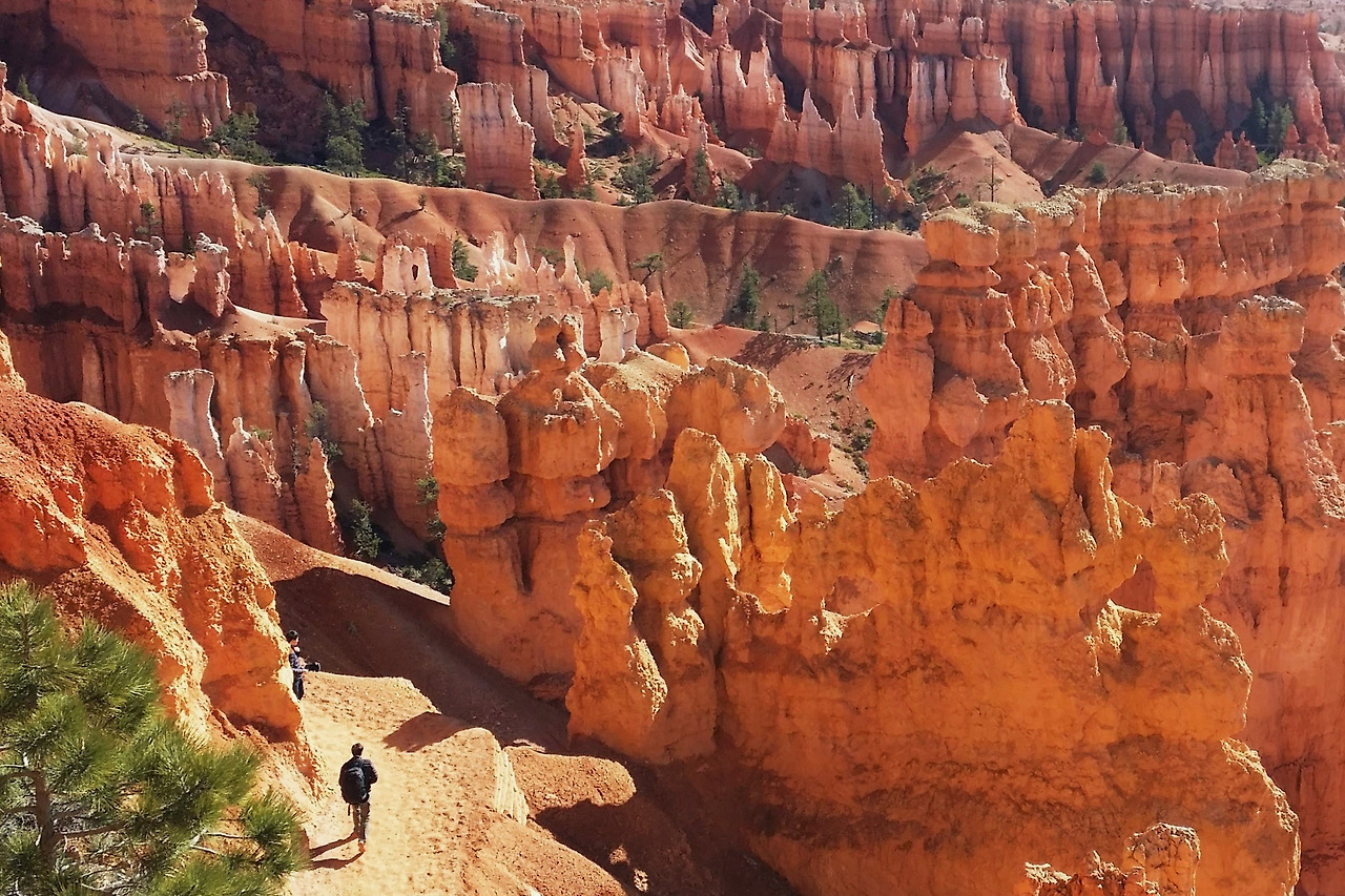 브라이스 캐년은 정착한 초기 정착민 브라이스의 이름에서 유래했단다. 그의 이름을 땄으나, 그가 이 아름다운 공원을 만든 것은 아니고, 자연이 만들어 준 선물이다. 캐년 중 가장 침식이 활발하여 현재도 고운 흙이 계속 흘러내리고 있다. 그래서 움푹 파인 커다란 분지는 세월과 함께 더욱 커지고 있다고. 처음 시작부터 아래로 내려가는 트레일이 지그재그로 급경사이다. 겹겹이 붉은 돌기둥 사이로 트레일이 내려다 보인다. 모두 각자 나름대로 일정을 즐기는 스타일이라 처음에는 함께 출발하고 어느새 뿔뿔이 흩어졌다. 먼저 아래로 내려간 팀이 뒤를 올려다보며 인증 사진도 찍으며 쉬엄쉬엄 전진이다.