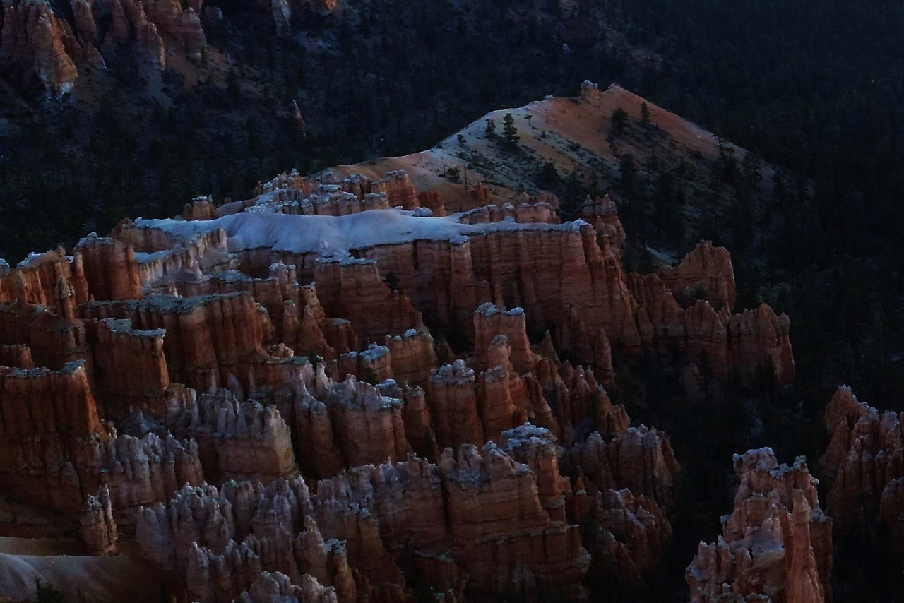새벽 5시에 일어나 브라이스 포인트 Bryce Point를 향해 출발했다. 일출을 보기 위해서이다. 우리 팀은 캡틴의 권유로 Sun Rise Point로 가지 않고 브라이스 포인트에서 일출을 보기로 했다. 이른 시간이라 관리인이 없는 입구를 지나 달리는데 자동차가 슬쩍 미끄러져서 순간 속으로 잠시 놀랐다. 새벽이라 바닥이 살짝 얼어 빙판이다. 이곳은 우리나라 5월보다 훨씬 춥다. 눈과 얼음이 아직 곳곳에 남아 있고 저녁에는 기온이 차갑게 내려간다. 혹 미서부 여행 중 일출을 보려면 계절에 관계없이 따뜻한 긴팔 겉옷은 필수이다.