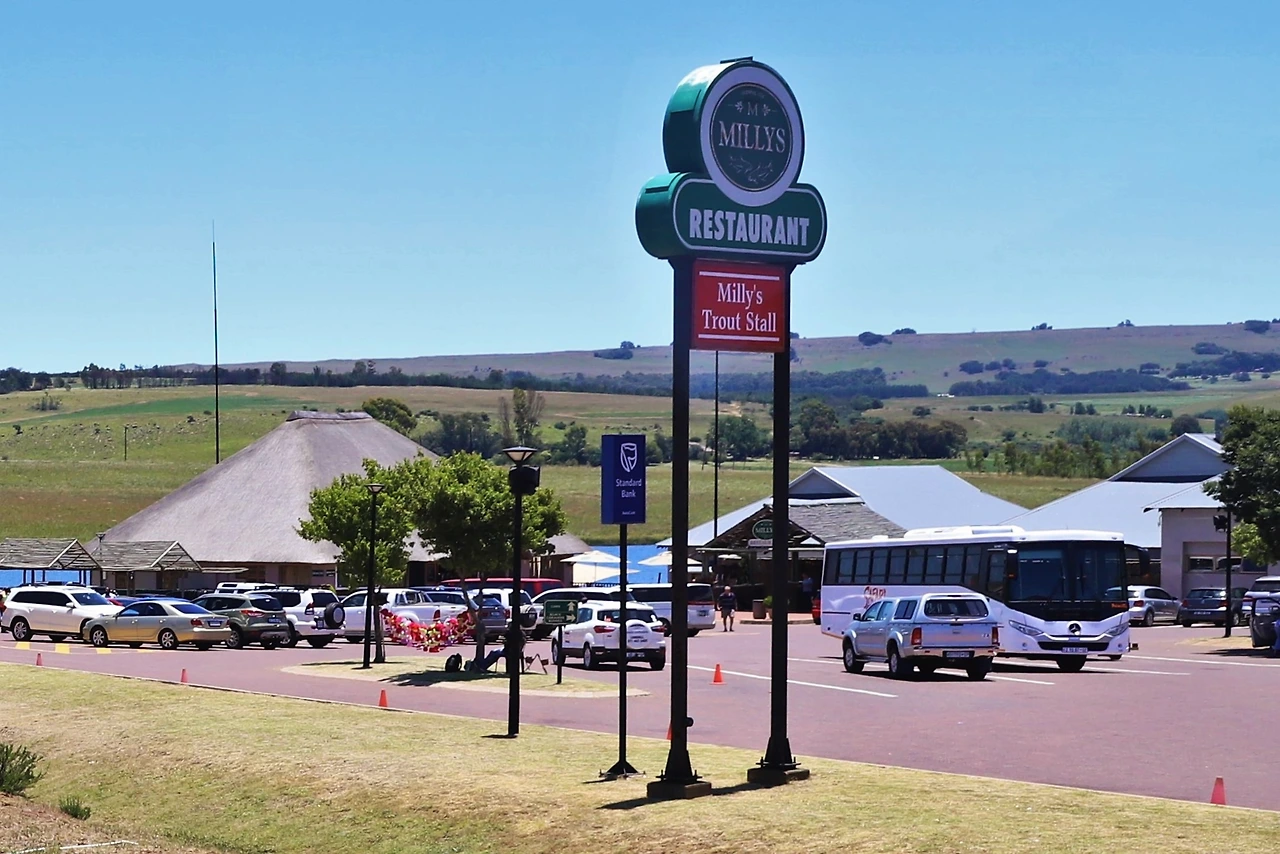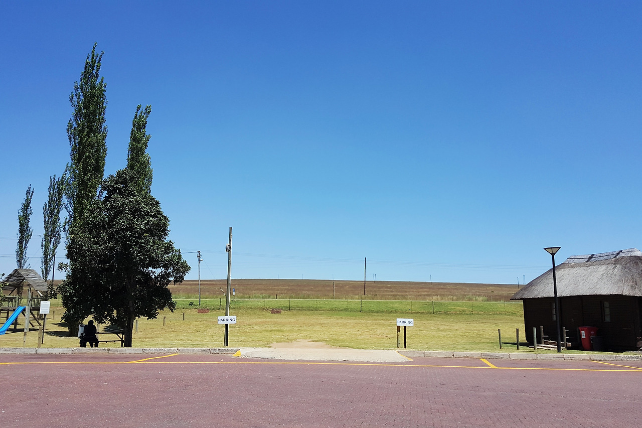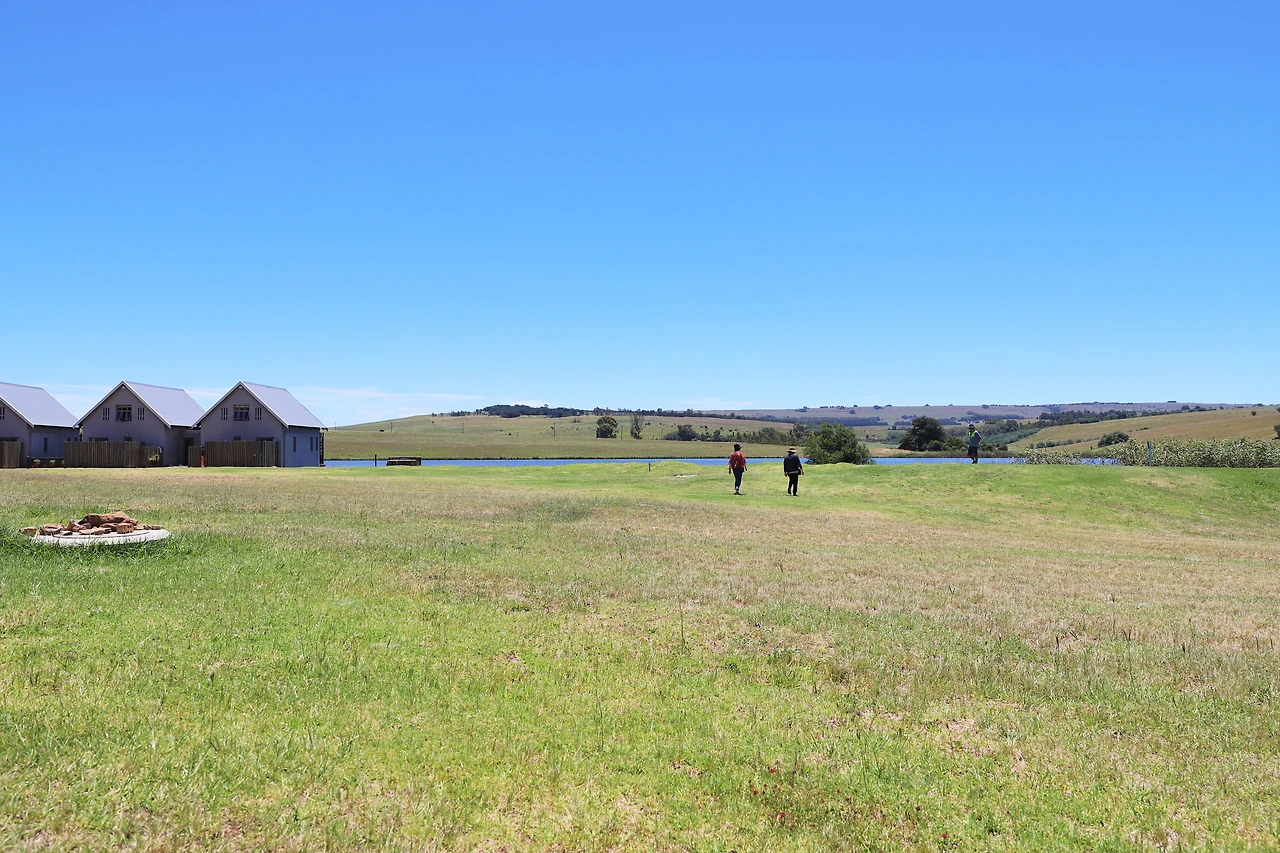 휴게소 뒤에 호수가 있고 얕은 언덕이 길게 푸른 초원으로 이어졌다.