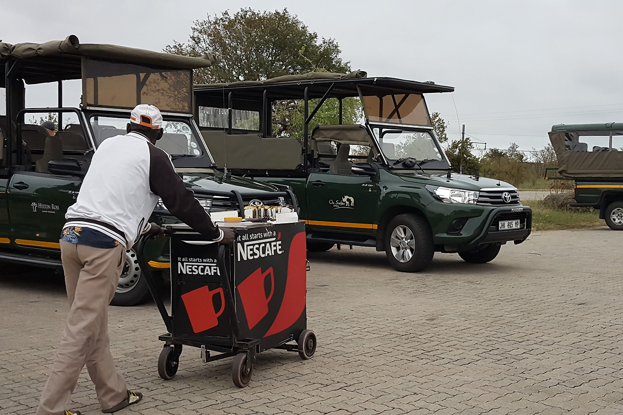 크루거 국립공원에서 게임 드라이브 game drive(공원 내에서 야생동물을 찾아다니는 드라이브)를 하는 날이다. 이른 아침인데 입구에 도착하니 벌써 모닝커피 카트가 커피 향을 풍기고 있다. 그리고 여러 대 어드벤처 트럭이 손님을 기다리고 있다.