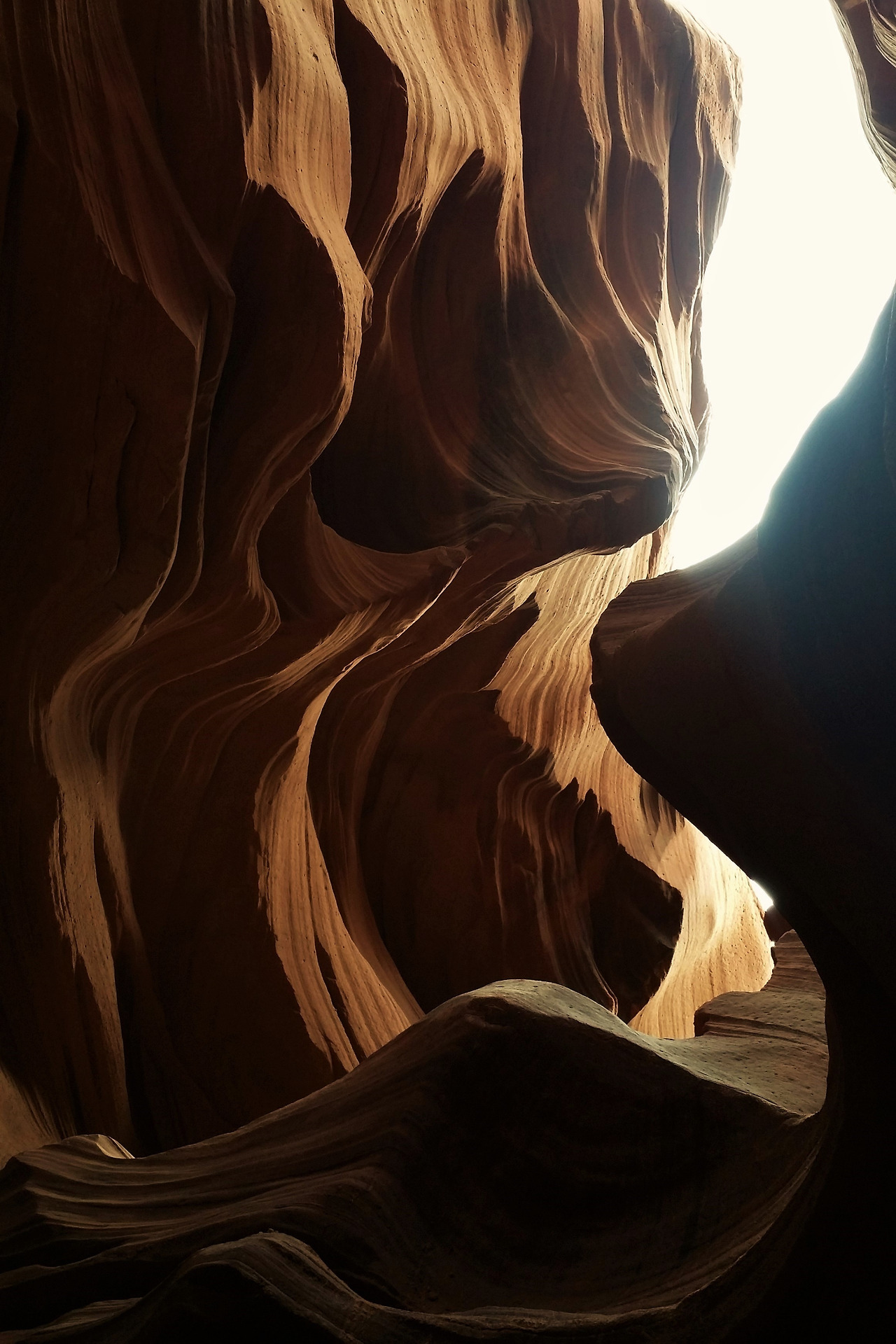 빛과 그림자가 만들고 있는 동굴의 모습에서 물이 흐르며 깎은 세월의 흔적이 섬세하게 잘 드러나 있다. 수백 년에 한 번씩 노아의 홍수가 있었을까. 줄무늬 곡선이 예술이다. 어떻게 이런 곡선 지형이... 바위틈으로 햇살이 들어오고 발을 옮길 때마다 조각된 바위의 형상과 색이 현란하다. 바위에 그려진 완만한 곡선이 조용히 춤을 춘다.