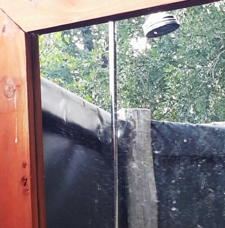 그런데 세면대 옆의 샤워실에는 천정이 없다.