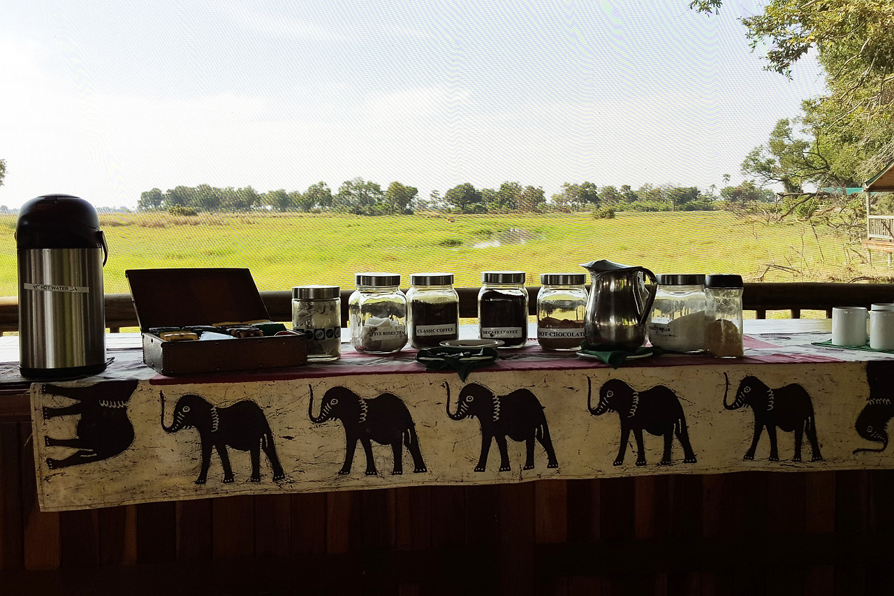 커피, 차 등이 세팅된 식탁보의 코끼리 그림도 정겹다.