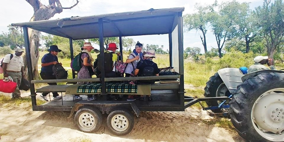 오카방고 델타의 목적지에 도착하니 트랙터를 개조한 손님 이동용 차량이 대기하고 있다.