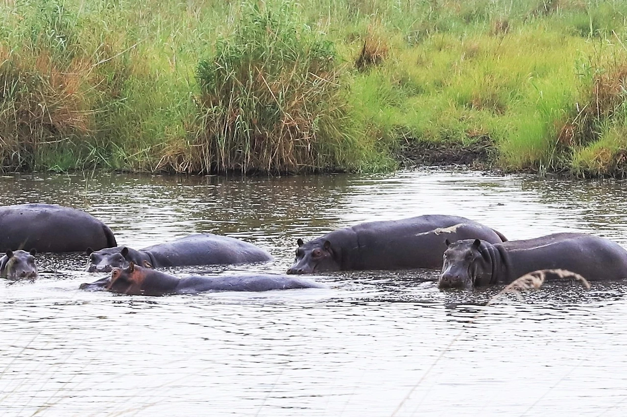 덩치 큰 하마가 강물에 몸을 담그고 떼 지어 역시 일렬로.