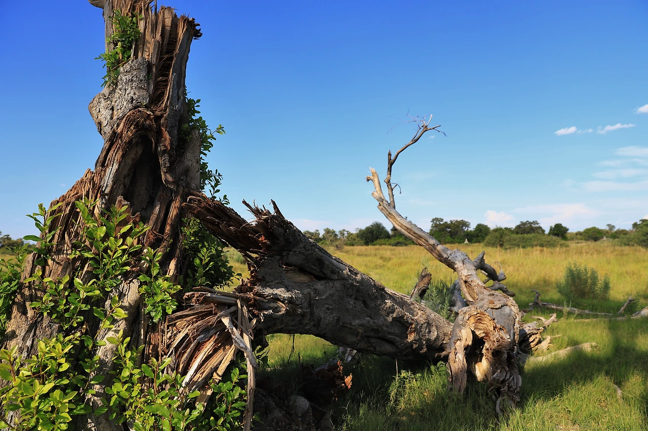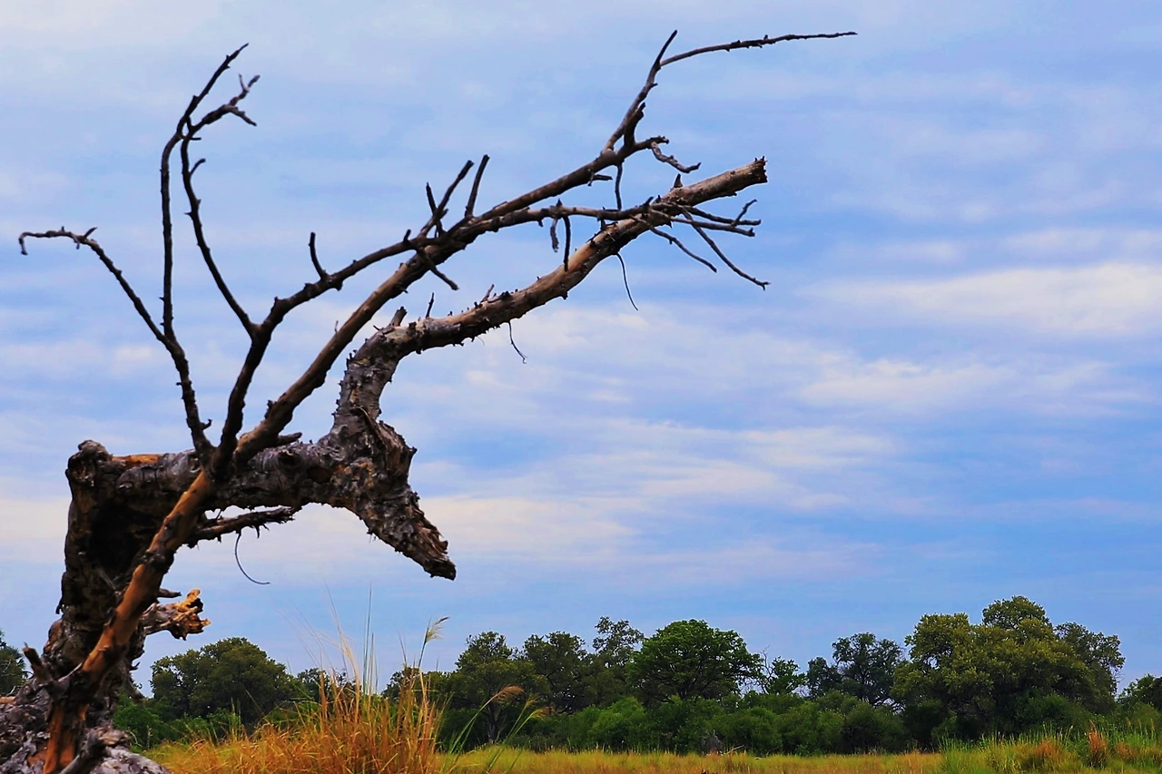 여름임에도 가뭄으로 누렇게 마른풀 가득한 초원에서 오랫동안 버티다가 고사목이 된 나무 기둥이 누워있다.