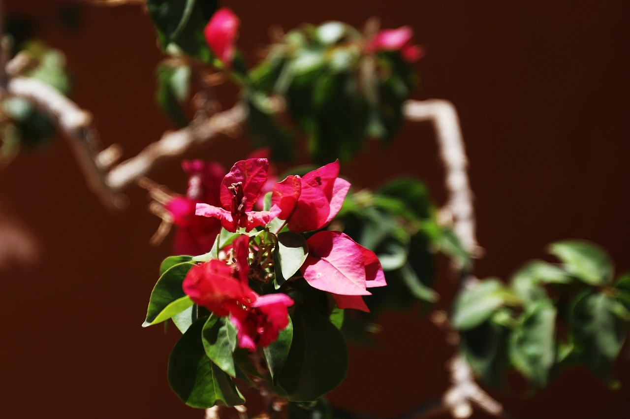 위 꽃나무에 붉은 꽃이 활짝 피었다.