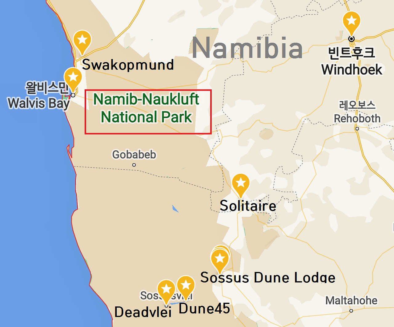 세계의 관광객이 찾는 나미브 사막의 Elim Dune, Dune 45, Deadvlei, Sesriem Canyon 등이 가까이 위치해 있다.