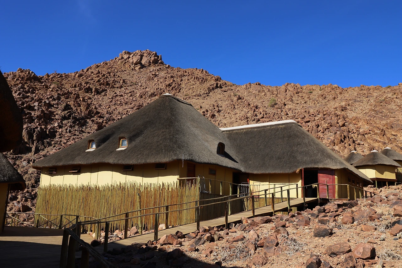 사막의 적갈색 바위산을 배경으로 안내 센터를 중심으로 양쪽으로 길게 객실이 늘어서 있다.