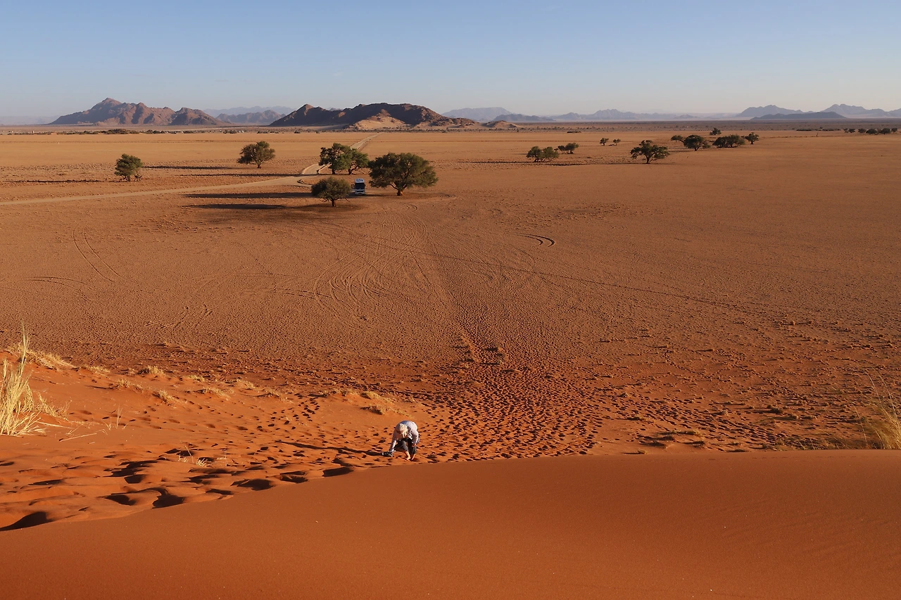 사막 입구의 솔리테어 휴게소를 지나 낮고 완만한 갈색 산지 사이로 뻗은 먼지나는 도로를 달려 나미브 국립공원