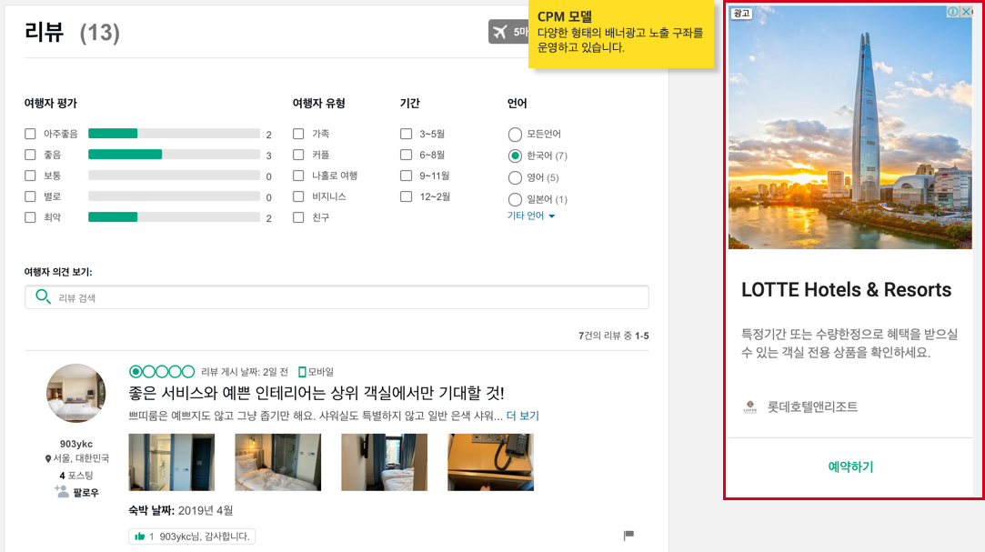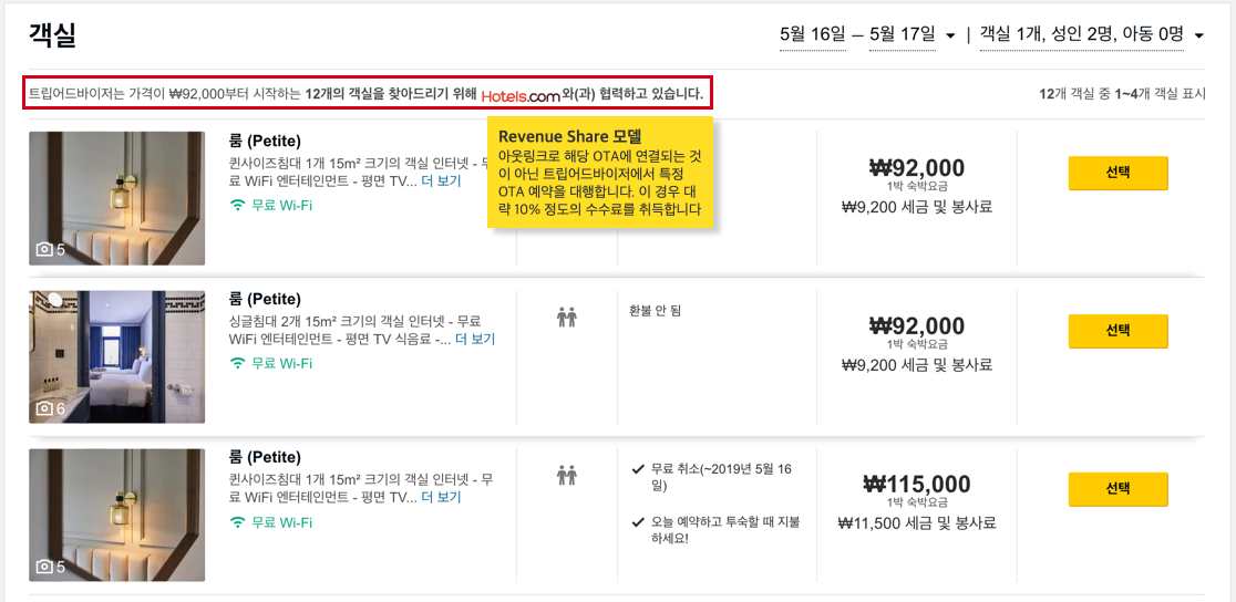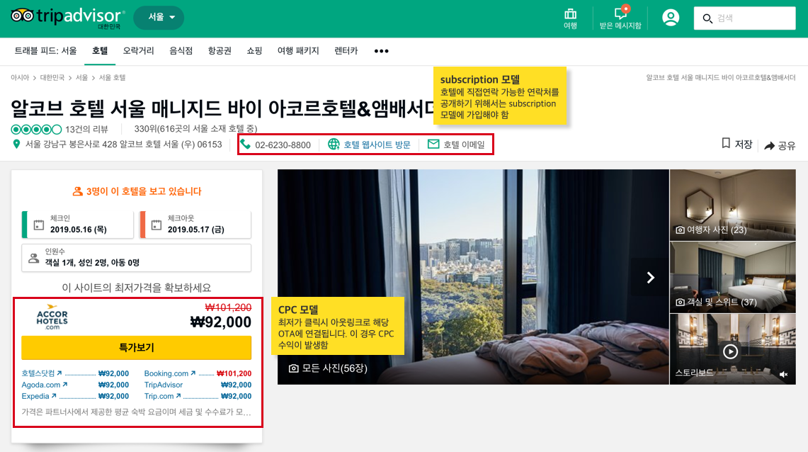 (2) 한국형 트립어드바이저 형태 : 상품 판매보다는 광고 기반 사업이 주력인 모델로 운영인력보다는 개발인력을 대폭 확장해야 합니다. 콘텐츠와 광고를 잘 믹스하는 것이 핵심 포인트! 이 모델의 한계는 트리플은 국내 아웃바운드 시장에 포커스 되어 있기 때문에 아웃바운드 시장이 정체되면 성장이 둔화될 수밖에 없습니다. 또한 현재까지는 가이드북 콘텐츠가 주력이기에 다양한 광고주를 확보하기가 어려울 수 있습니다. 아래 이미지는 트립어드바이저에서 숙소 상세정보를 조회했을 때 수익으로 연결되는 다양한 BM 샘플입니다. 링크