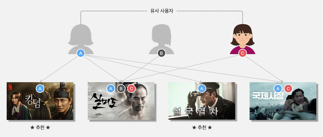 그래서 A와 C를 유사 사용자로 묶고, A는 시청했는데 C는 시청하지 않은 킹덤과 설국열차를 추천합니다.