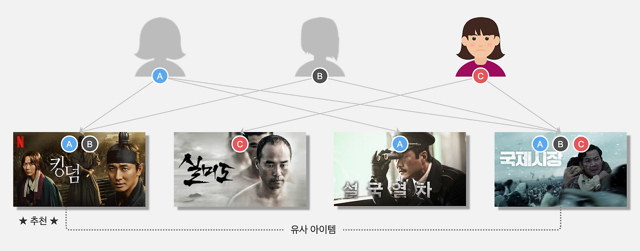 A와 B의 시청기록을 바탕으로 킹덤과 국제시장을 유사 아이템으로 묶을 수 있고,