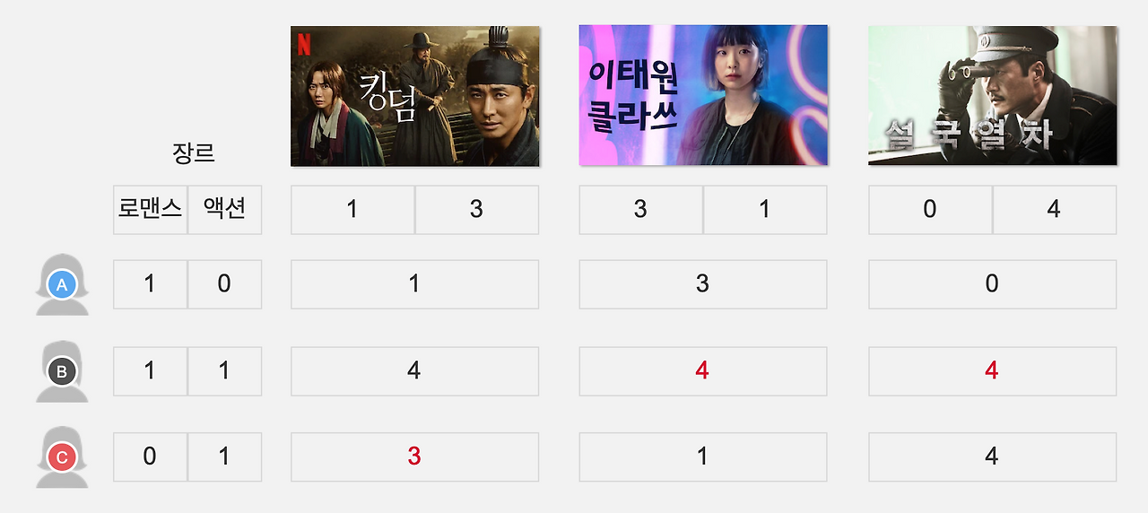 그리고 사용자의 시청 데이터를 바탕으로 사용자별 장르 선호도를 값으로 산출합니다. B의 경우 로맨스 선호도와 액션 선호도가 각각 1점입니다. 이 데이터를 바탕으로 아직 시청하지 않은 이태원 클라쓰와 설국열차의 예측 평점을 4점, 4점으로 쉽게 구할 수 있습니다.