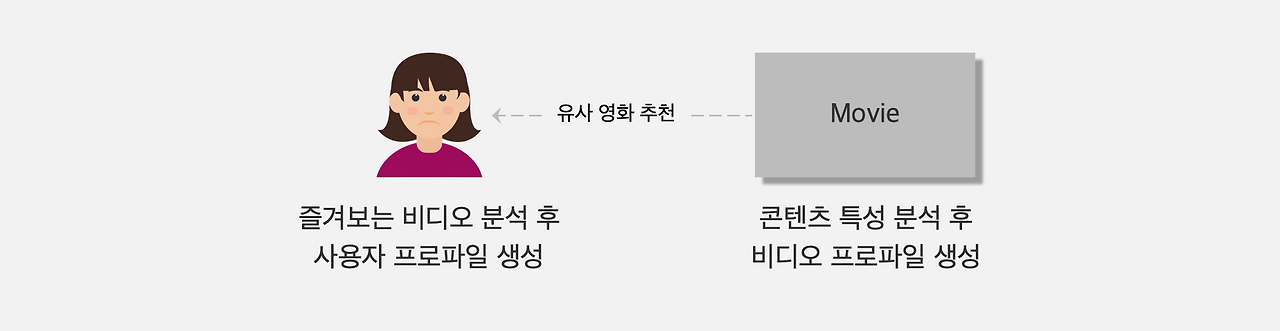 영화 타이틀을 기준으로 배우, 장르, 국가, 시대, 연령대 등 수백 개의 영화 특성을 분석해 영화 프로파일을 생성하고, 타깃 사용자가 좋아한 영화를 바탕으로 사용자 프로파일을 도출합니다. 그리고 영화 프로파일과 사용자 프로파일을 비교해서 사용자 선호 영화를 추천하는 방식입니다.