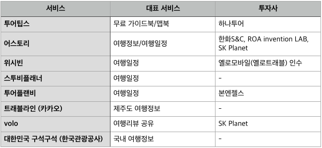 그렇다면, 지금의 여행 미디어 시장에는 누가 활동하고 있을까? "여행 미디어=콘텐츠 기반 사업자"라고 정의했을 때 투어팁스, 어스토리, 위시빈, 스투비플래너, 투어플랜비, 트래블라인, volo, 대한민국 구석구석 등이 있다. 이들 대부분이 투자 지원을 받고 있으며, 투어팁스를 제외한 나머지 서비스는 사업 운영을 위한 수익모델이 불안한 상황이다. 투어팁스의 수익모델은 다음 포스팅을 통해 별도로 다룰 예정이며, 한국관광공사는 공기업인 관계로 비교 대상에서 제외하도록 하겠다.