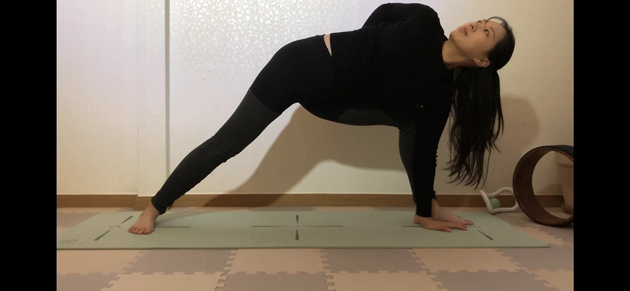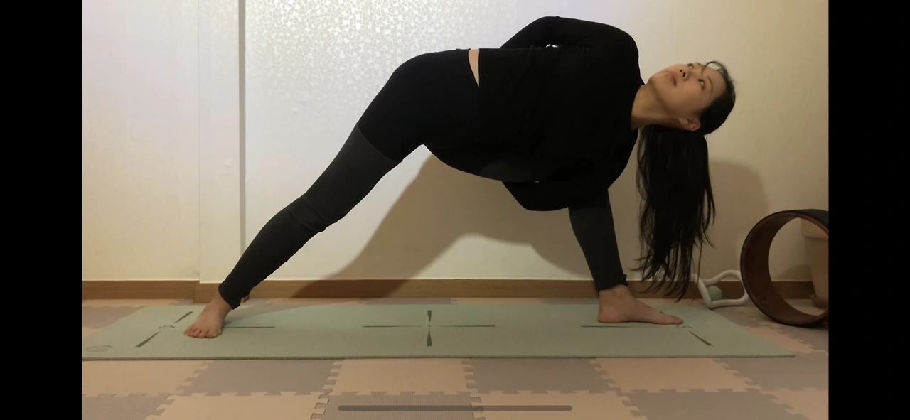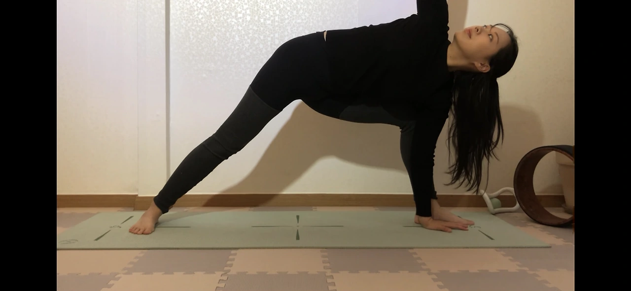 반대손을 천장쪽으로 길게 뻗어주며 천장쪽의 손끝을 바라봅니다
