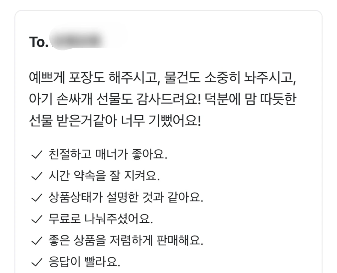 ‘MBTI는 혈액형 따위와 다를 게 없지. 나는 최고니까. 라고 말하는 참으로 이성적인 남편은 어느 날 나를 이해할 수 없다는 눈빛으로 바라본다. 내 물건을 구입하는 맘께 드릴 손편지;;와 곁들일 (시기 지난) 아기 물품을 정성스레 포장하고 있었기 때문이다. 남편은 푼돈 받고 파는데 포장에 편지까지... 왜 ’남‘을 위해 시간을 써가며 고생하는지 도무지 이해가 안 된다고 했다.