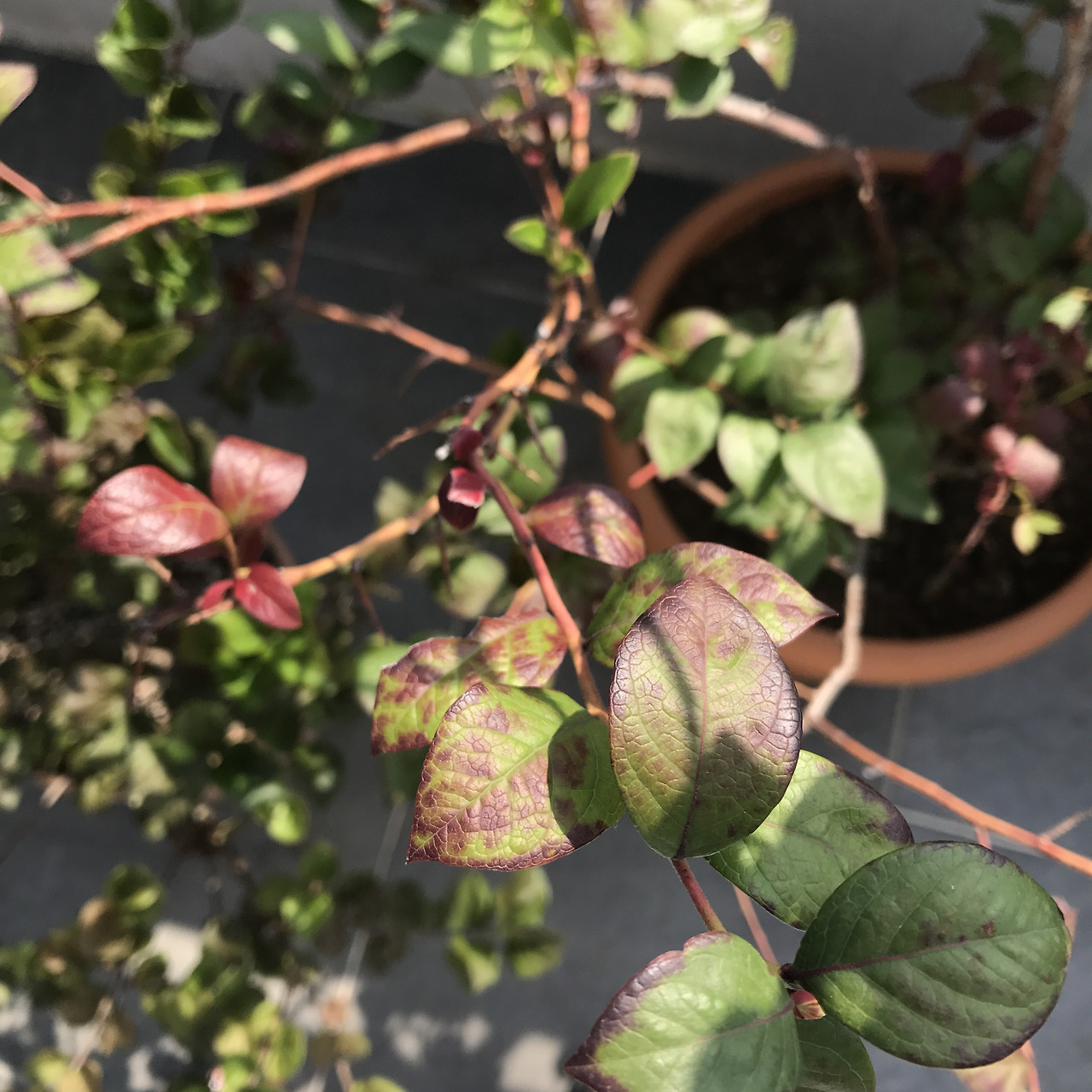 열매가 다 떨어지고 가을이 되어 온도가 낮아지면, 블루베리는 단풍을 준비한다. 이렇게 가까이 단풍 과정을 들여다보다 보면 나무가 마치 병드는 것처럼 보이기도 하는데, 단풍이다.
