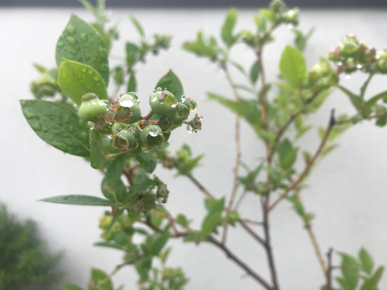 나뭇가지의 곡선들과 너무 노랗지도 진하지도 않은 알맞은 색깔의 녹색과, 그림 같은 나뭇잎은 블루베리가 익어가는 여름을 더욱 싱그럽게 한다. 열매가 막 달렸을 때는 마트에서 보는 블루베리보다 사이즈가 작아 보이지만, 익어가면서 사이즈가 어느 순간 확 커진다.