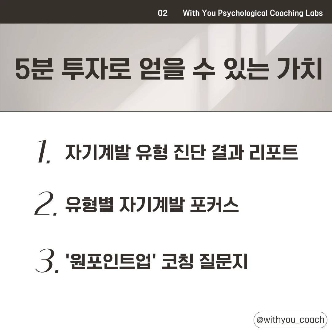 단순히 점수만 확인하는 것으로 끝나는 것이 아닙니다. 나의 결과를 바탕으로 내면의 욕구와 강점을 구체적으로 탐구하고, 이를 기반으로 나만의 루틴과 실행 계획을 세울 수 있는 '원포인트업 코칭 질문지'를 제공합니다. 코칭 질문을 통해 막연한 목표가 아닌 실질적인 성장 위한 첫 시작을 준비할 수 있습니다.