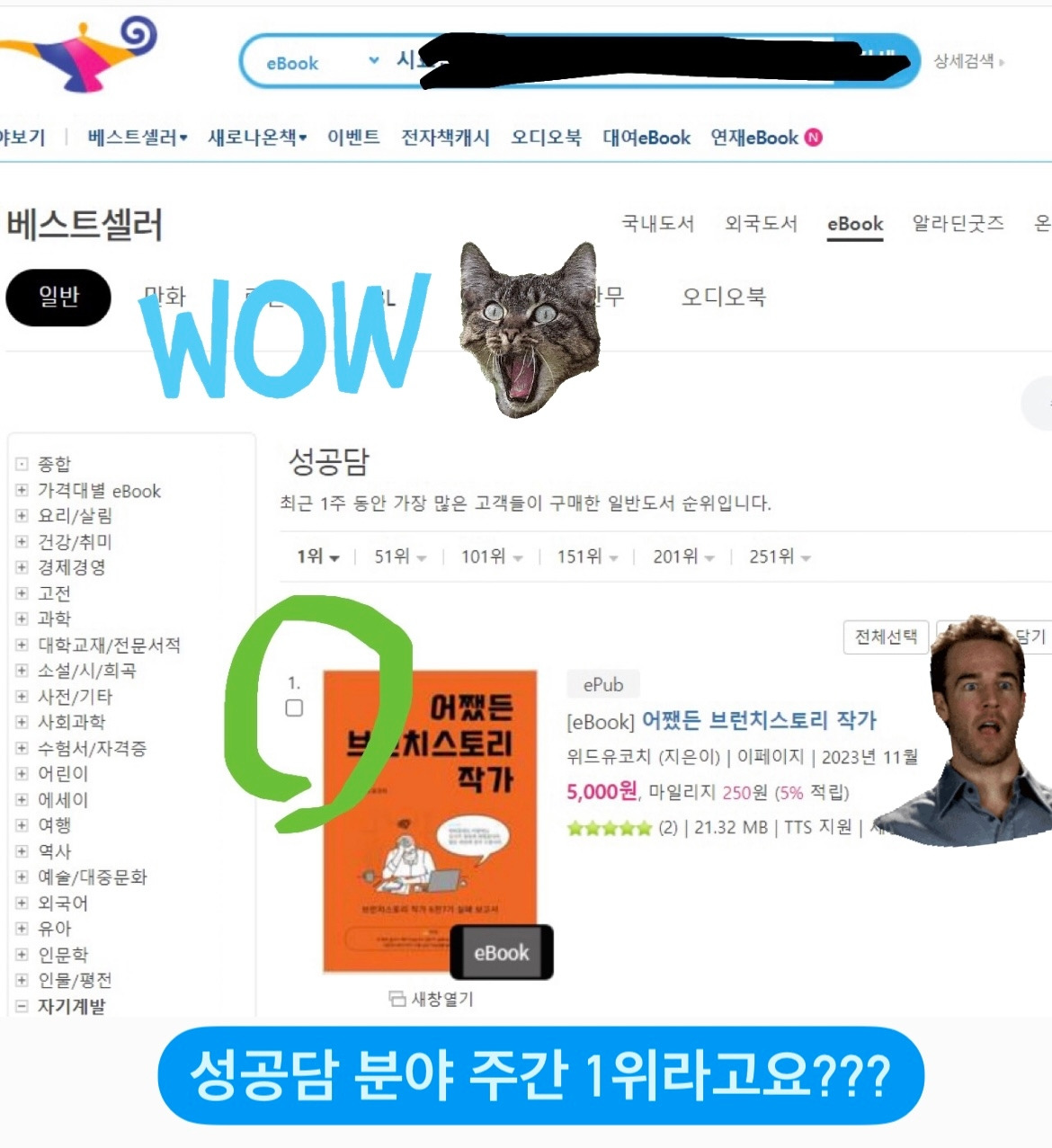 그리고 나의 실패보고서는 2023년 11월 5주 차 알리딘 전자책, 성공담 분야 주간 1위가 되었다.