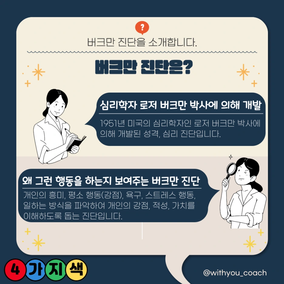 버크만 진단은 1951년 미국의 심리학자 로저 버크만 박사가 개발한 개인 특성 진단 도구입니다.