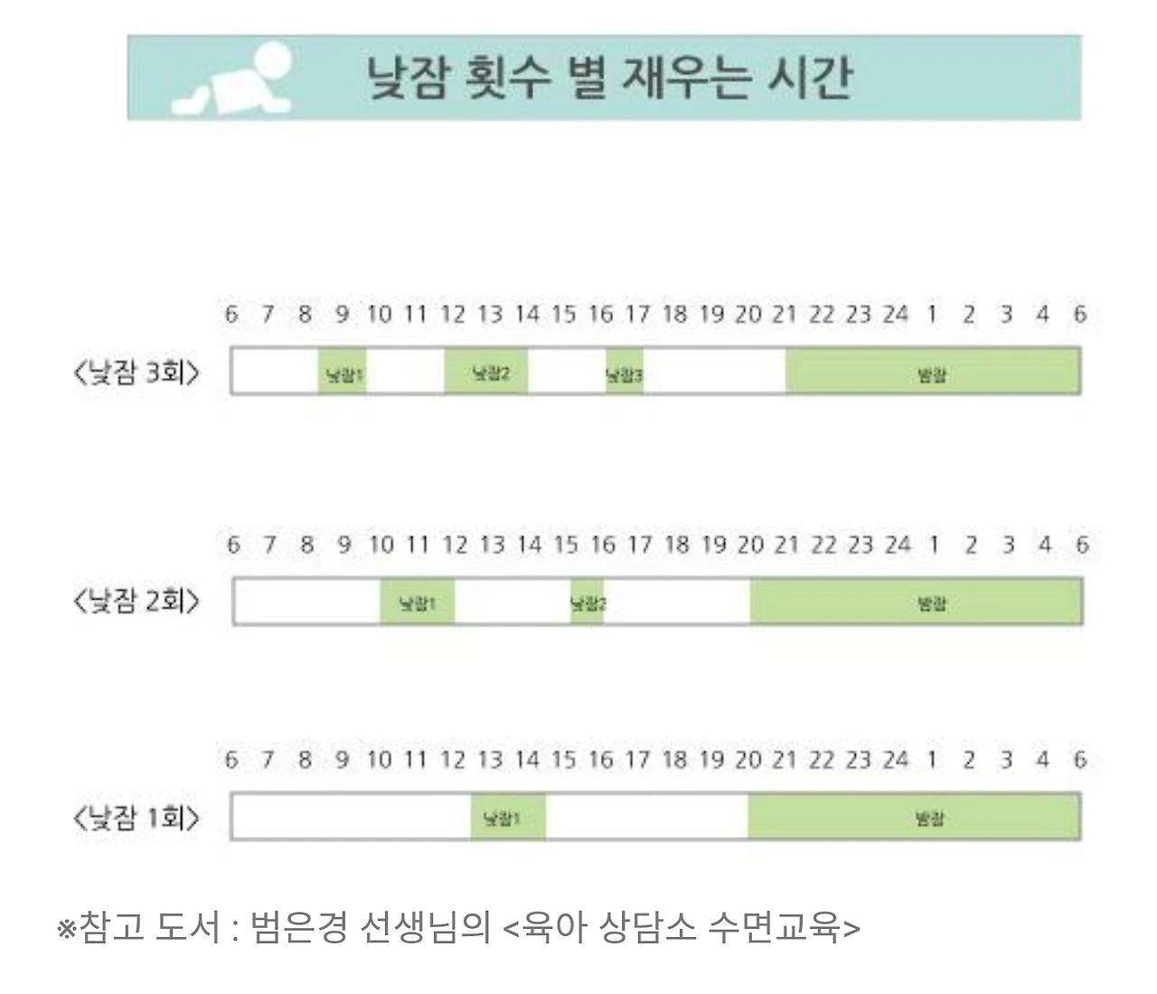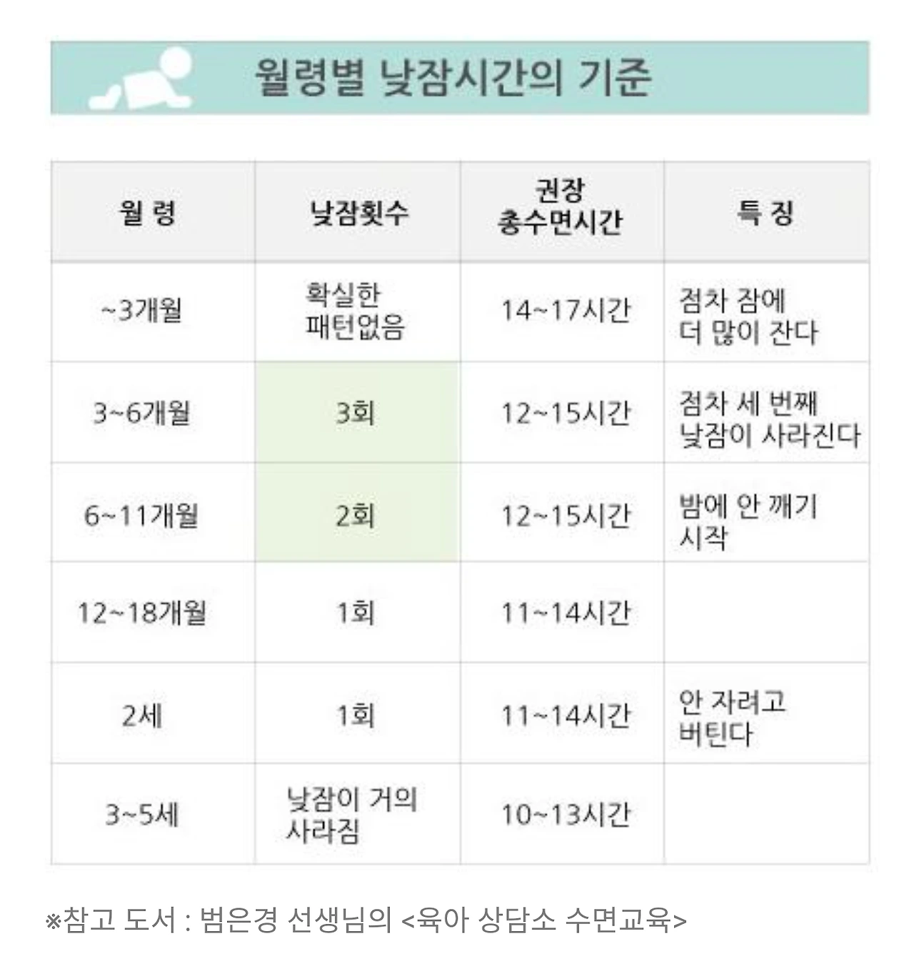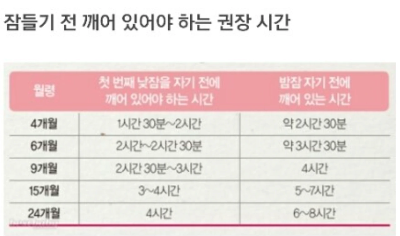 2. 아기 개월수 별로 마지막 낮잠에서 일어난 시간에서 일정 시간이 지나야 밤잠을 잘 수 있다. 아래 표에 니와 있듯이 6개월 아기라면 마지막 낮잠에서 일어난 시간이 오후 5시면 오후 8시 반에 밤잠을 잘 수 있다.